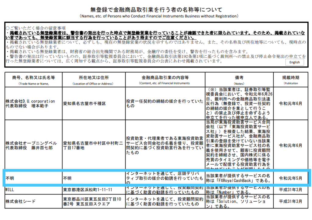 ロイヤルキャッシュバックは金融庁に警告を受けている点にも注意