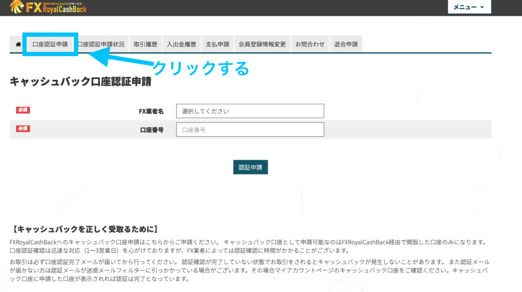 会員ページ上部のメニューバーから口座認証申請をクリック。そうするとFX業者名と口座番号を入力する画面にジャンプします。
