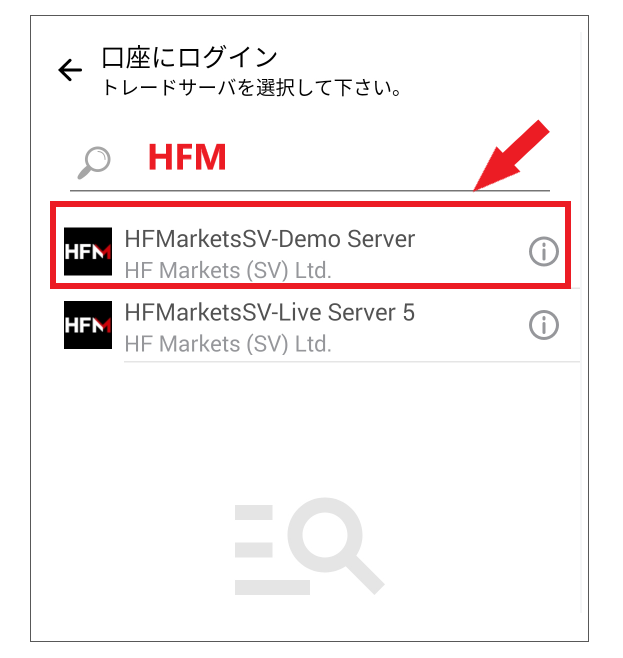 次の画面で、証券会社(ブローカー)名を検索する画面が出てきますので、「HFM」と入力して該当するサーバー名を選択してください。