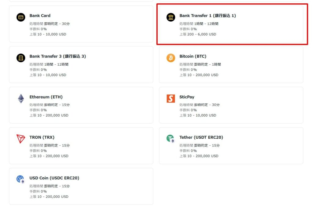 入金方法の一覧から「Bank Transfer(銀行振込)」を選びます。